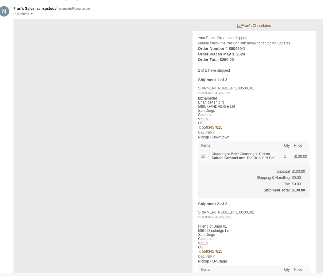 2/ When that button is clicked; email for that order is sent. Example email sent: