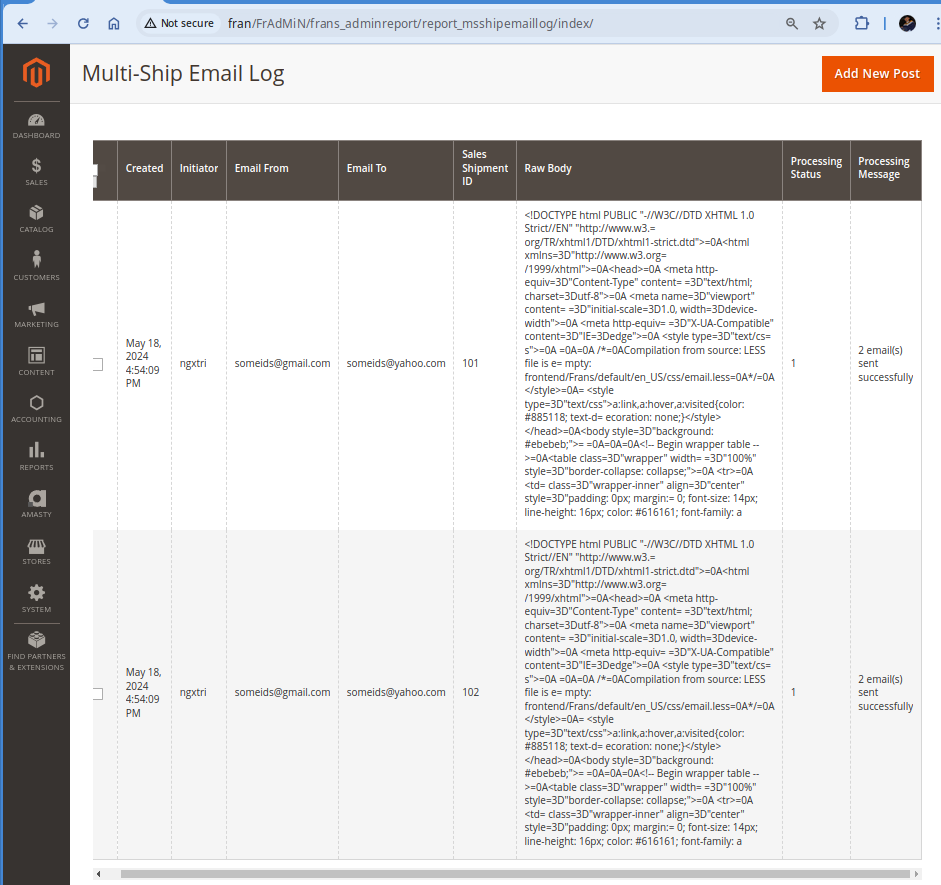 3/ Admin Report: Multi-Shipment Email Log. Use this report to review which emails have been sent; and sent to which sales_shipments: